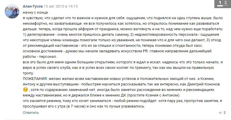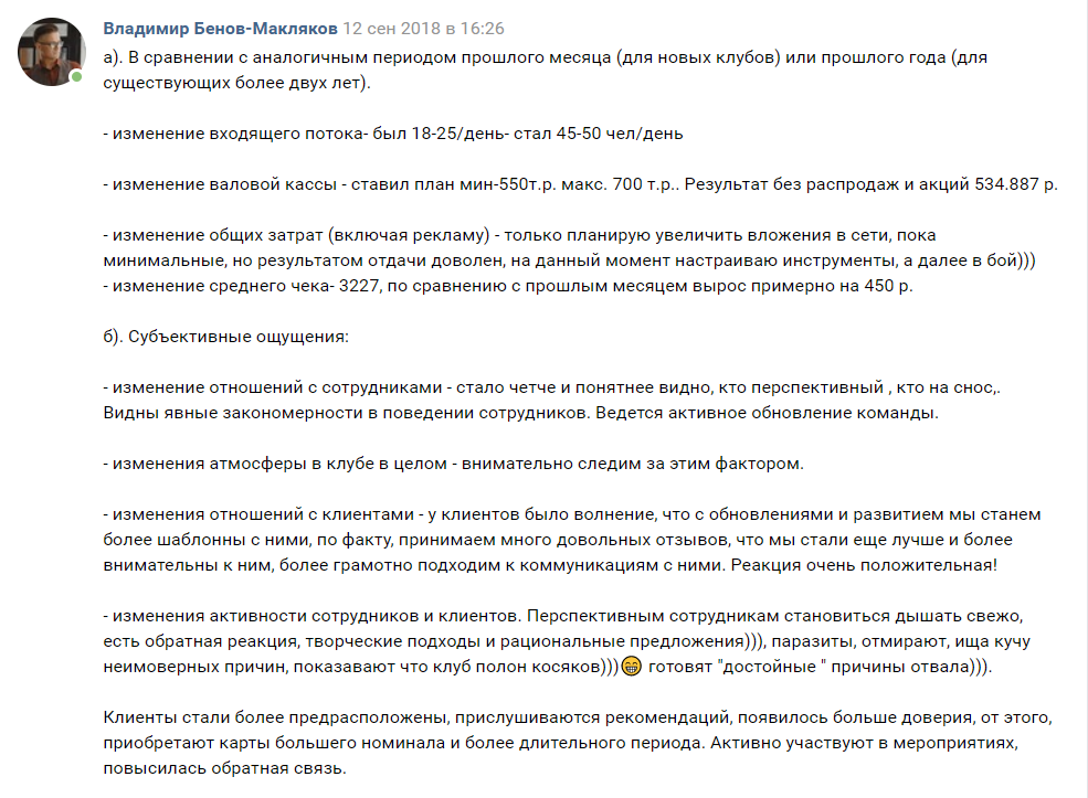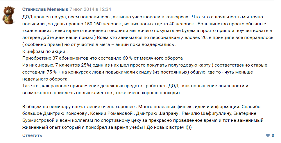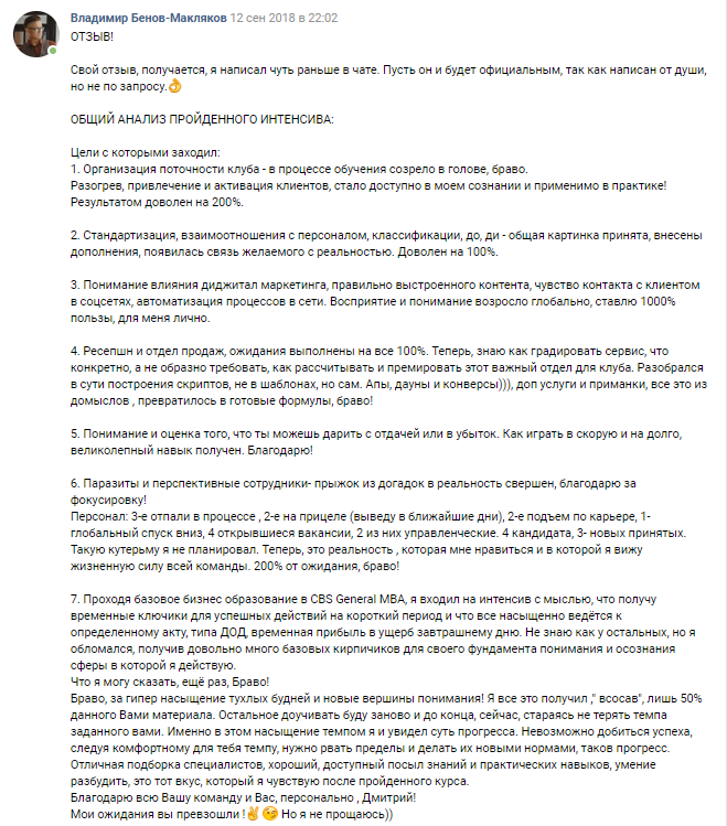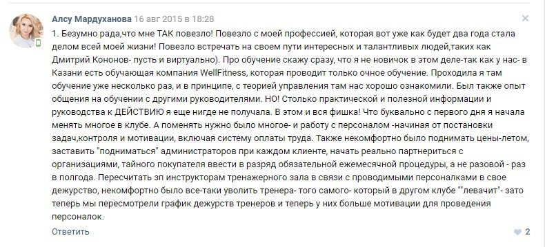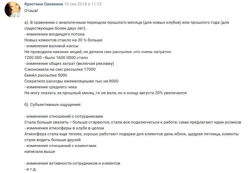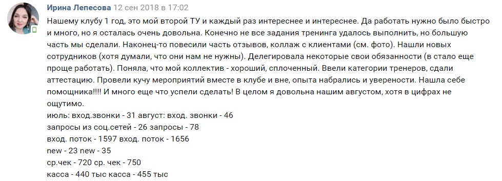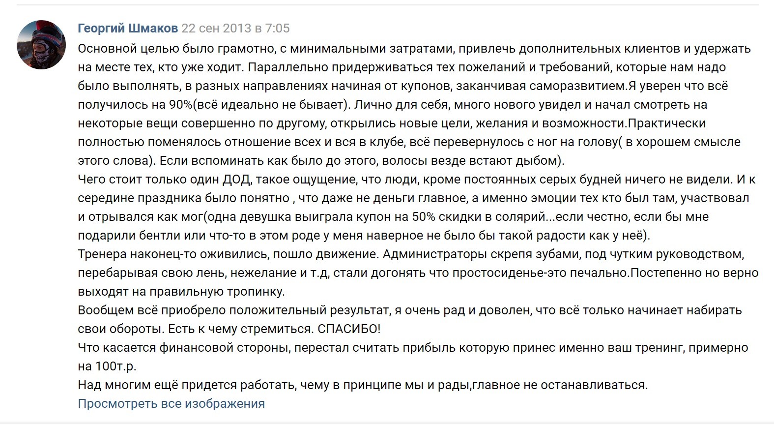Получили массу "фишек" по улучшению сервиса и общению с клиентами, по прайс-листу, по организации работы персонала, по ведению соцсетей... Это реальный "апгрейд" своего фитнес-клуба и я считаю, что нужно проходить этот тренинг каждый год!