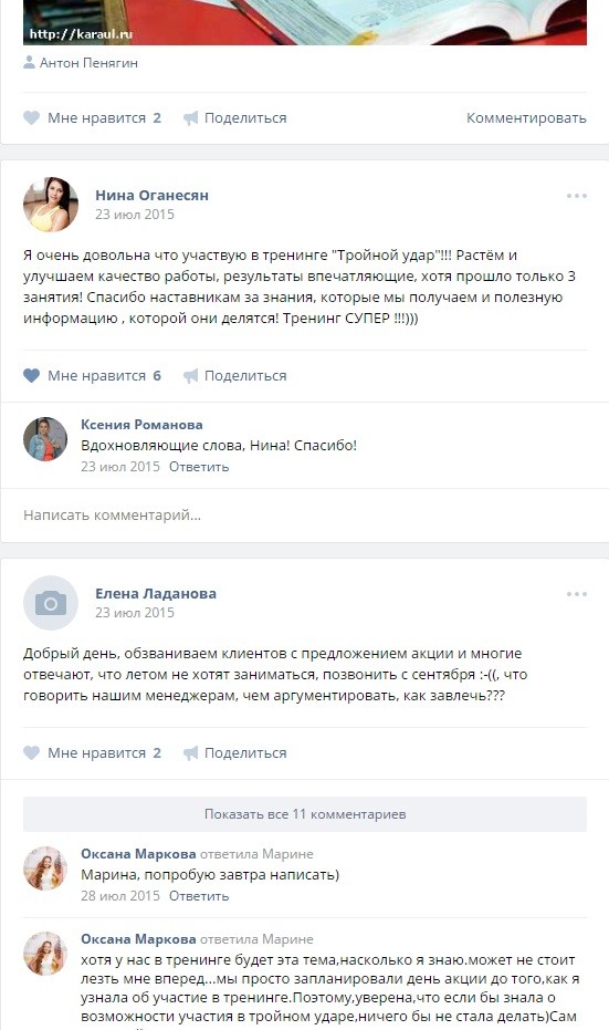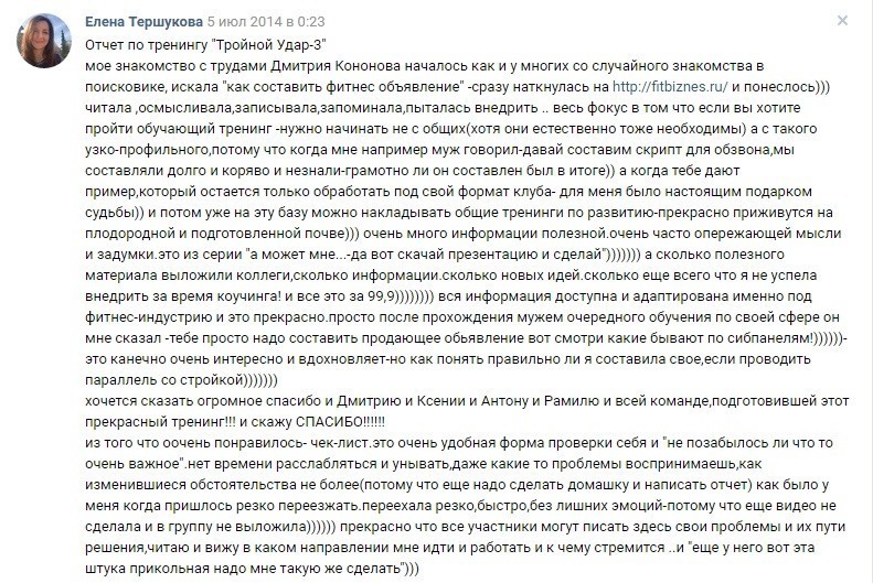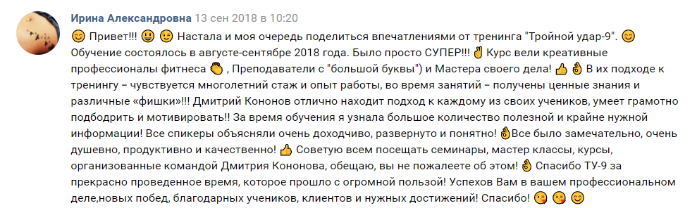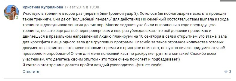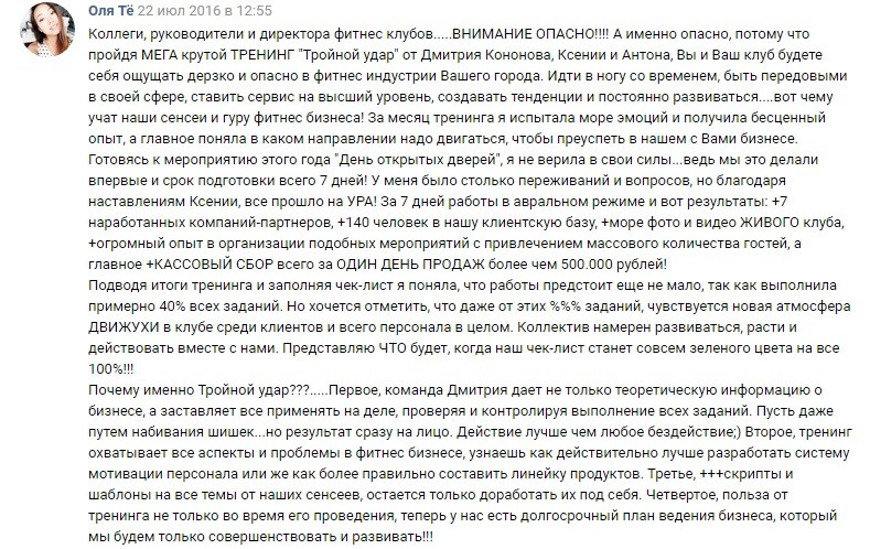 Этот тренинг нужно пройти всем руководителям и управленцам фитнес-клубов: он поможет вам лучше управлять персоналом, быстрее получать прибыль. За 2 года с того времени я прошла много других тренингов, но, поверьте, "Тройной Удар" был самым лучшим!