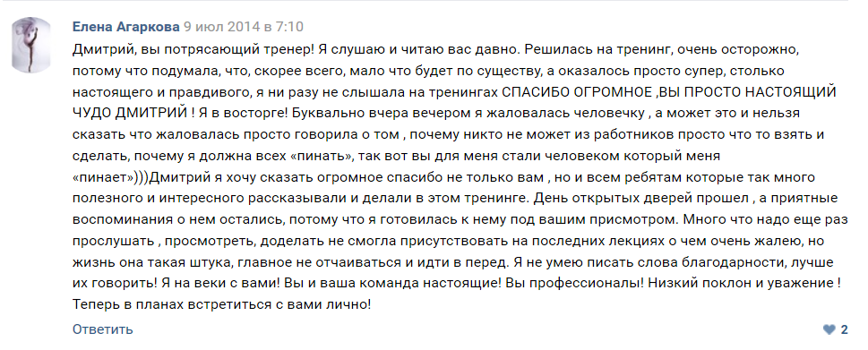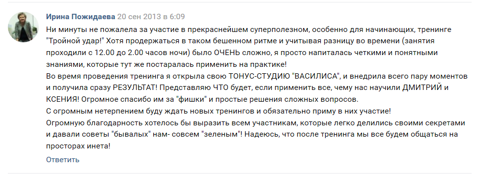 Я являюсь "ветераном" обучения у Дмитрия и его команды: участвовала уже в двух потоках "Тройного Удара" и с удовольствием иду в ближайший, 8-й. Для меня он будет особенно интересным, потому что я буду встречать его в РОДДОМЕ! Обязательно поделюсь с вами своими ощущениями и результатами :)