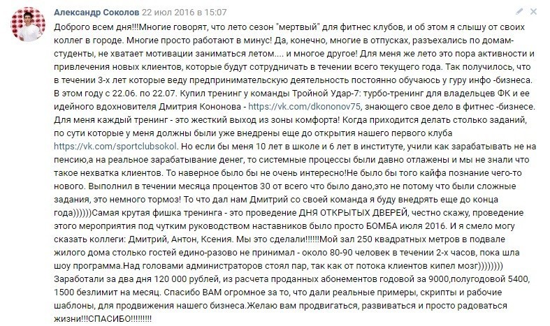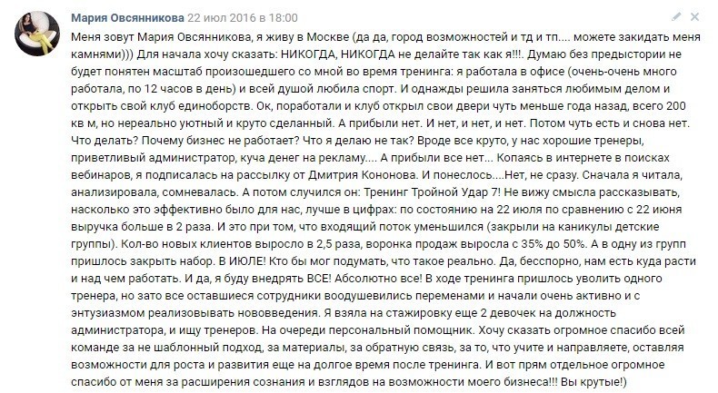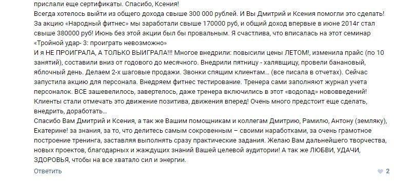 Тройной Удар - это не просто тренинг "по продажам", это целостная система выстраивания фитнес-бизнеса, скрипты, шаблоны, документы и рекомендации на все случаи жизни. Ну и, конечно, финансовый результат. Я советую каждому руководителю пройти этот тренинг!