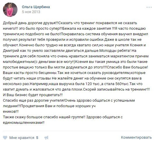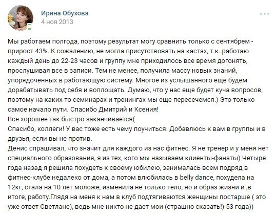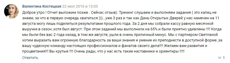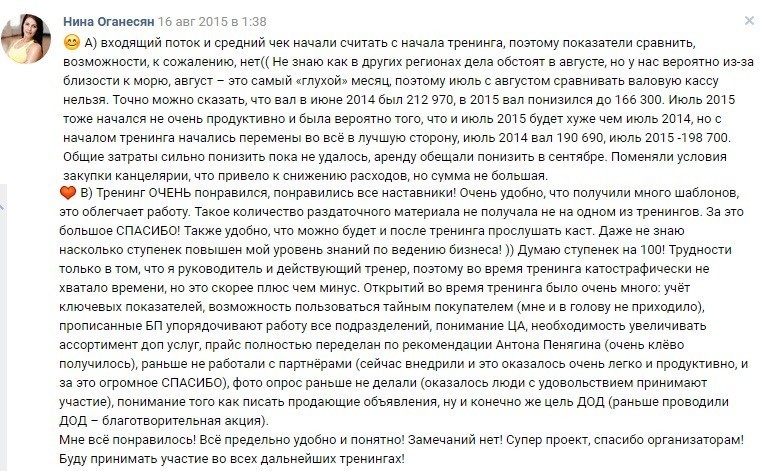 Выполнив всего 10% заданий тренинга, увеличила кассу на 46% по сравнению с аналогичным периодом прошлого года! (Марина Захарова, г. Авдеевка)