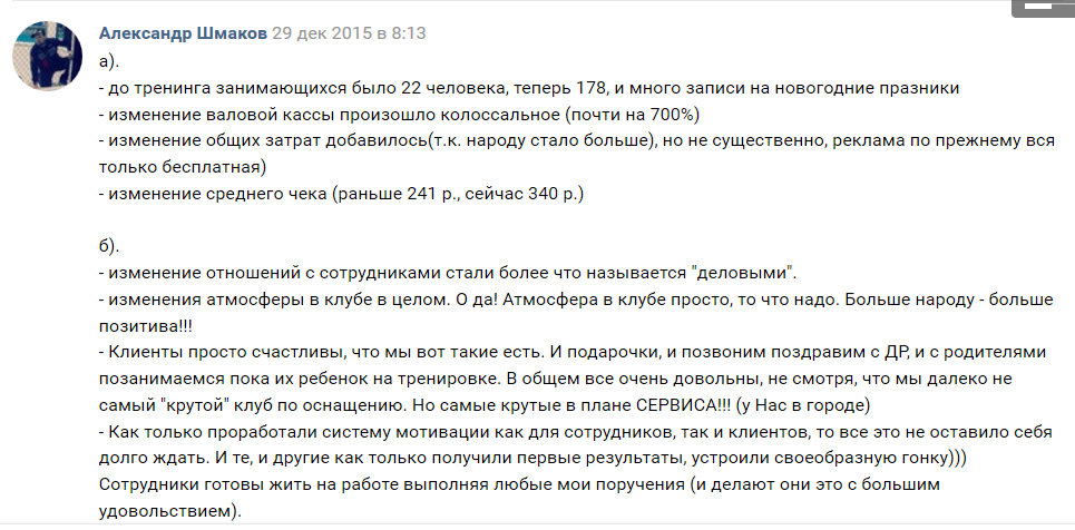 До тренинга было 22 клиента, после тренинга - 178! (Александр Шмаков, клуб единоборств "Спарта", Первоуральск)