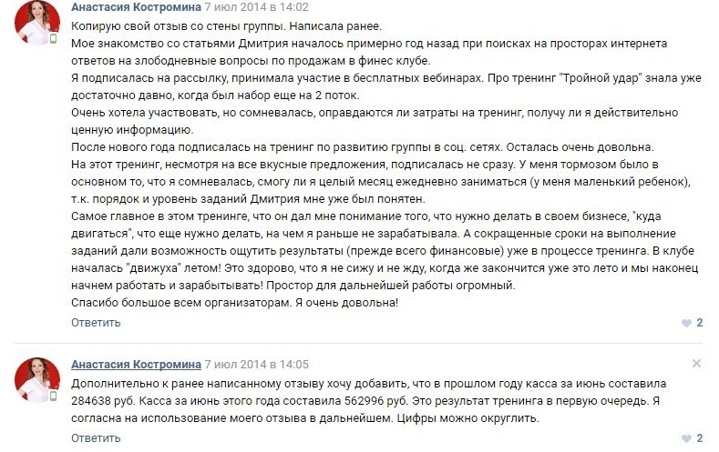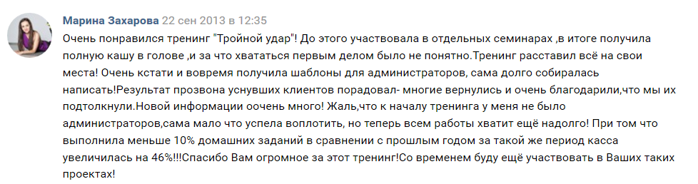 Прохожу "Тройной Удар" уже не в первый раз. Первый же тренинг дал ФАНТАСТИЧЕСКИЕ результаты: в первый месяц после тренинга касса увеличилась на 30%, во второй месяц - на 140%!