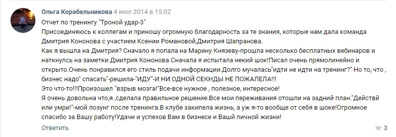 Деньги (цена тренинга) - это, наверное, основной вопрос, почему некоторые люди отказываются от участия. Вложения, которые я сделала в тренинг окупились сполна, я собираюсь расширять свой бизнес и с удовольствием иду в "Тройной Удар - 8"!