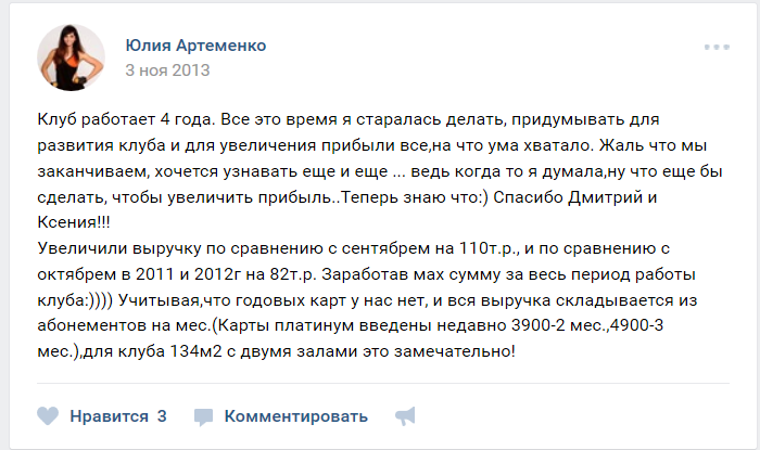 Три года назад наш клуб был в огромной-огромной з... У нас тогда появился федеральный конкурент, и после тренинга у меня был четкий план, куда идти и что делать, чтобы исправить ситуацию. Рекомендации Дмитрия работают "на ура".