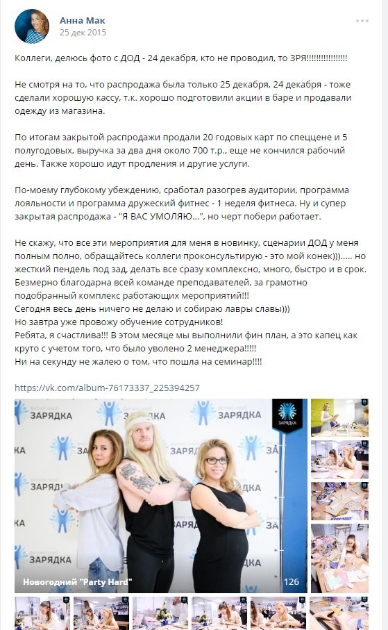 На 50% увеличила продажи в сравнении с прошлым месяцем, средний чек вырос с 700 р до 1450 р , при том, что был уволен 1 сотрудник отдела продаж! (Анна Мак, ФК "Зарядка", Екатеринбург)